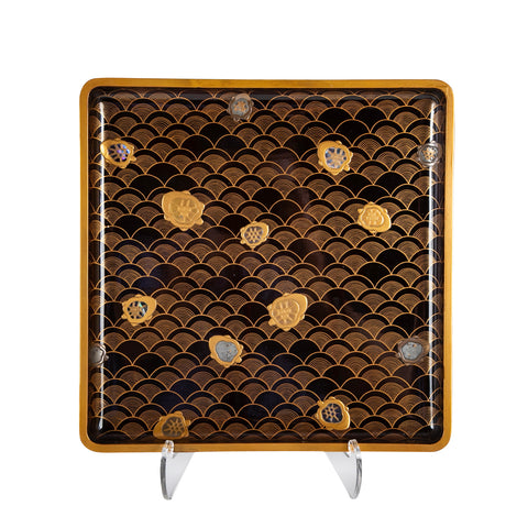 Japanese square black lacquer tray with gold and silver Takamaki-e turtles on wave pattern decoration. Meiji period ( 1868 - 1912 ).