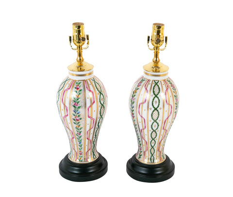 A pair of Dresden urns  of baluster form with decor of ribbon, wreath and floral motif now lamps.  Early 20th century.