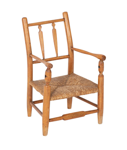 American child's chair with combination of woods - ash, birch and maple having a rush seat and arrow back slats. Circa 1900.