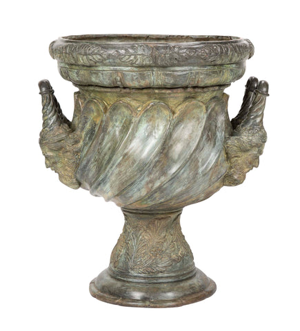 A substantial bronze garden urn with handles having excellent patination.  27 H x 24 Diam.