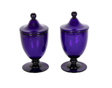 Pair of English Regency Cobalt Blue Blown Glass Covered Urns
