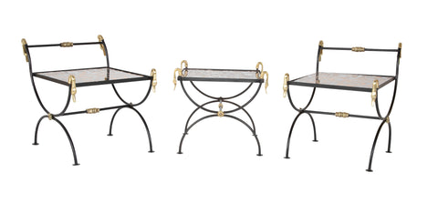 1930s three piece iron and brass coffee table with Versace insets/tops. Can be used together as one long coffee table or used individually as side tables. Chairs measure : 22.5" H x 23" W x 17" D 15.5". H seat height.