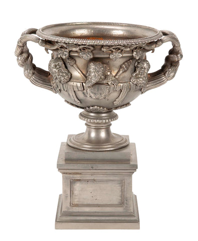 English Regency Warwick Vase in polished steel. A handsome rendition of the famous Roman original. After it's excavation from Hadrian's Villa in the late 18th century it caused a sensation and copies were made in various sizes and materials. More typically made in cast iron or bronze, this steel example is more unusual. A stunning centerpiece. Decorated with heads of various gods, lion skins and grape vines.