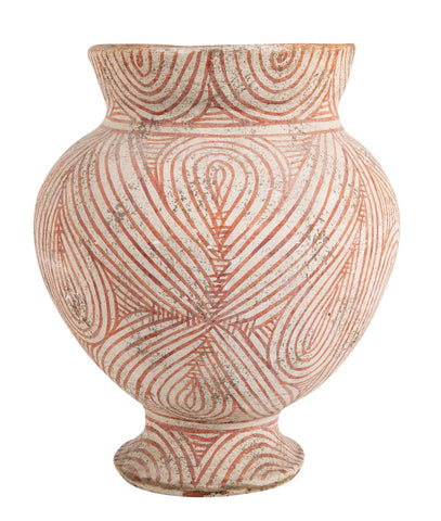 A "Ban Chiang" pottery vessel in buff on red having geometric design.