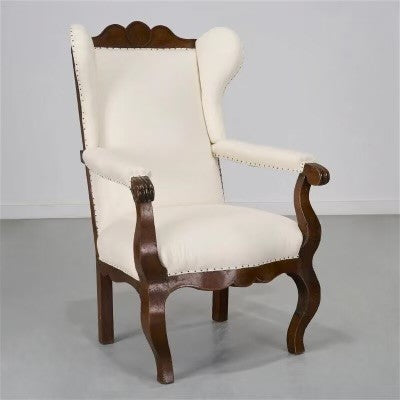 An early 19th century Anglo Dutch walnut wingback chair covered in white muslin fabric.