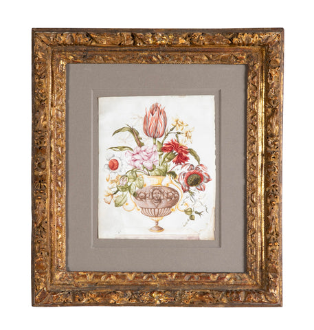 Mid 19th century Dutch School still life water color on vellum of flowers in mid 18th century carved and gilt frame.