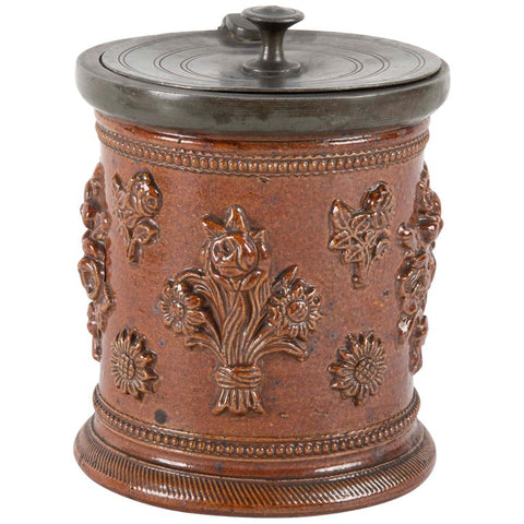 A fine example of a German Baroque tobacco jar with original pewter lid. The rich ocher salt glaze decorated with raised floral motifs. A handsome addition for the collector of pipes and tobacco accessories. Circa 1725.