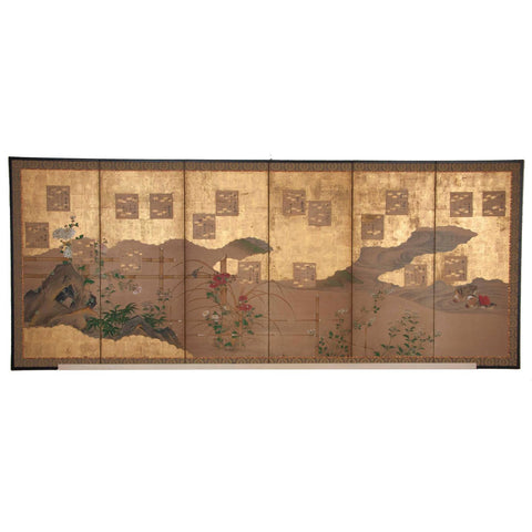 A six-panel Japanese paper screen with poems, autumn flowers, bamboo fence and Mandarin ducks. Poems are believed to be earlier but were probably added.