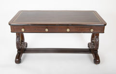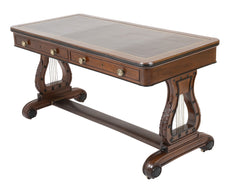 A striking English Regency mahogany sofa / writing table with lyre ends and ebonized detailing. Stretcher and desk top newly covered with leather. Circa 1820.