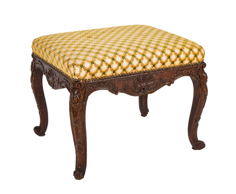 French Regence carved oak bench with shell motif and scrolled cabriole legs. Early 19th century.