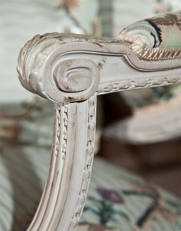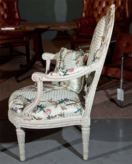A pair of Louis XVI style carved open arm bergeres having beautifully painted frame and fabric.