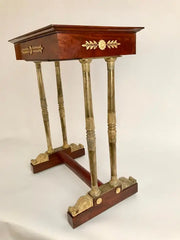 A very fine Continental Regency period mahogany lift-top dressing table with high quality bronze d'ore legs and mounts. The columns with capitals decorated with palm leaves and papyrus flowers showing the Egyptian influence that became popular in the Regency and Empire periods after Napoleon's expeditions to Egypt in the early 19th century. Made originally as a vanity, this table will make a singular side table, a stunning addition to any room, antique or modern. Circa 1815.