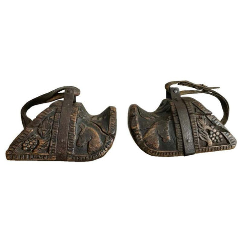Fantastic pair of 18th-19th century South American carved wooden stirrups. Known as estribos, each are carved from a solid block of wood. Decorated with wonderful carvings of horse heads and grape vines, these are truly charming pieces of Folk Art. With wrought iron stirrup rings and the original leather straps. Rich chocolate patina that only comes from age and use. Worn by Chilean huasos, highly skilled horsemen akin to America's cowboys.